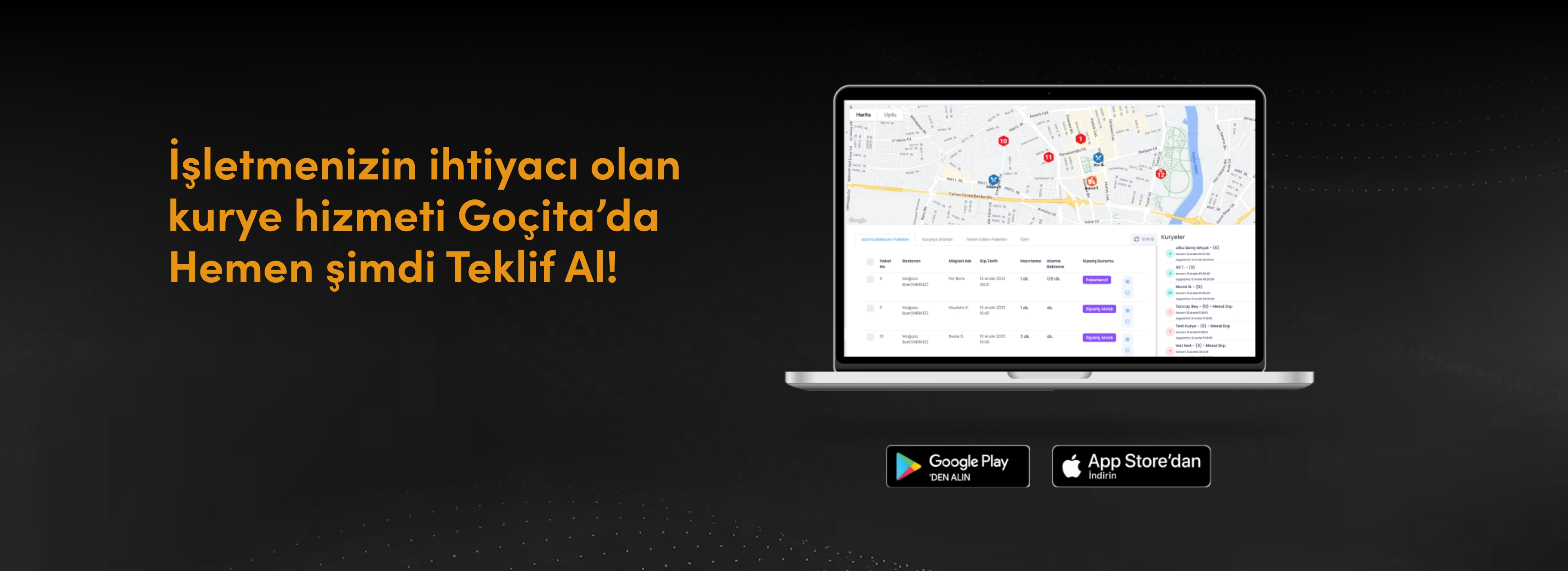 Goçita’nın yenilikçi kurye uygulaması, siparişlerinizi hatasız ve hızlı bir şekilde müşterilerinize ulaştırmak için tasarlandı. Gelişmiş teknolojik altyapımız sayesinde siparişleriniz doğru kuryeye otomatik olarak atanır ve her aşama anlık olarak takip edilir.